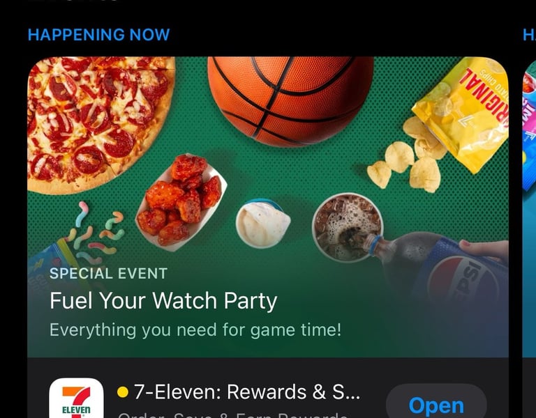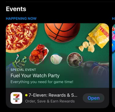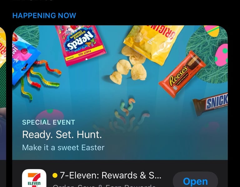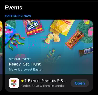7NOW is the line of business that drives the most content work. They frequently run overlay campaigns, need new app push notifications, and run app events in the Apple App Store and Google Play Store. The most recent event tiles were run for both the 7-Eleven app and the 7NOW app. The campaigns for March Madness and Easter pushed the 7-Eleven app from #14 in the app store to #1.