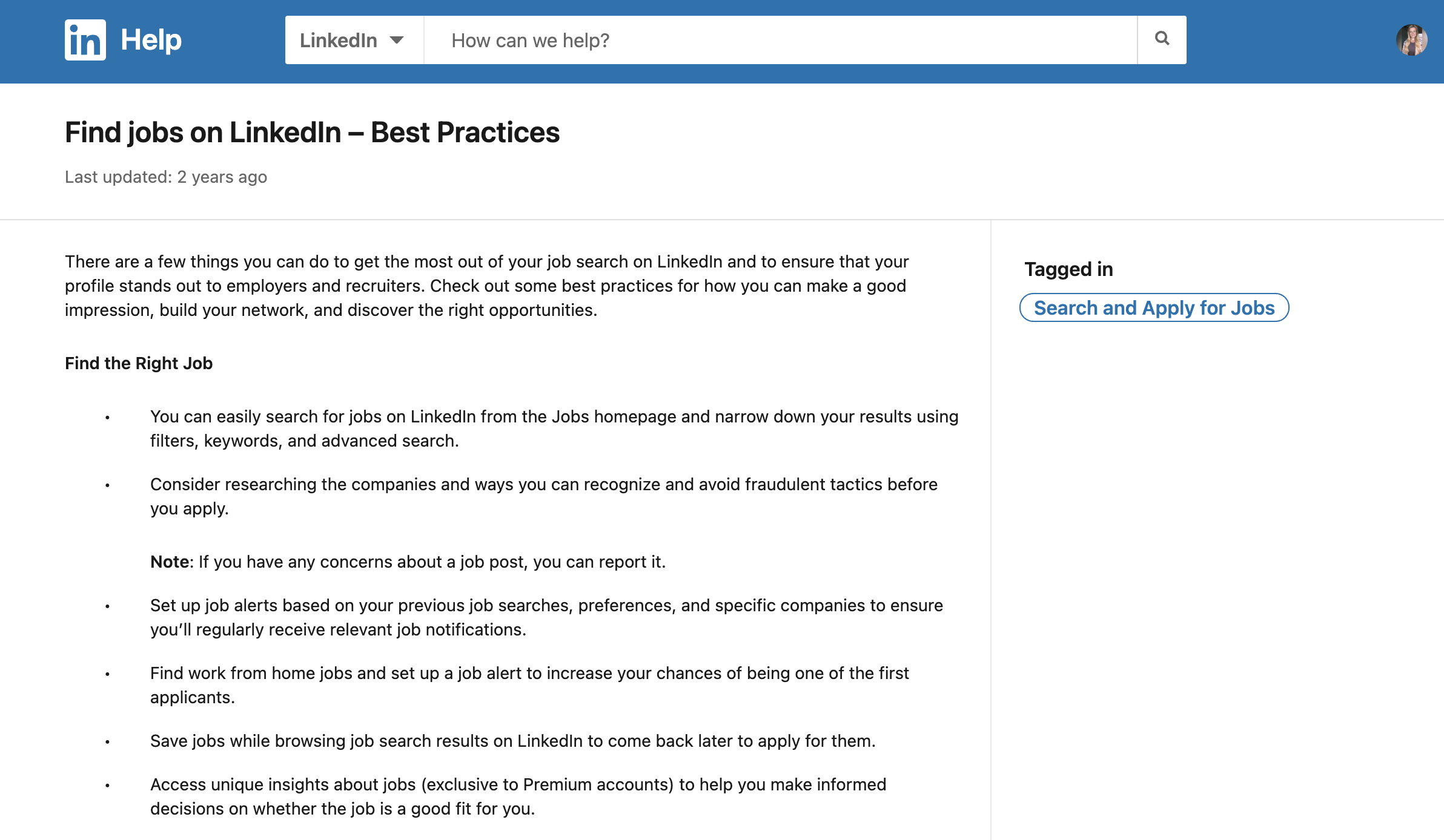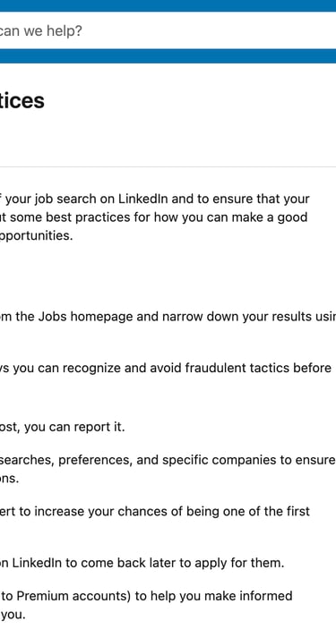 The article was unique in the sense that it was the first Best Practice available on the LinkedIn Help Center and that it had a PDF checklist attached to it that LinkedIn members could download and print. The article was deep-linked on the job search area within the LinkedIn desktop/browser view and saw a massive success rate - 97% helpfulness score (70% was the baseline for high quality content) and 475% higher page views than any other help center article.